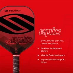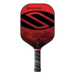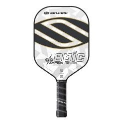 The AMPED Epic X5 has a unique face and X5 core that reduces noise and vibration while increasing the consistency of the paddle’s touch. This allows you to keep the ball on the paddle longer and increase your control during placement. The design has Selkirk’s “S” logo above center with a colored background on the upper half of the paddle and white below.