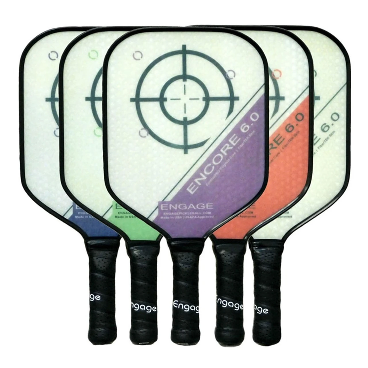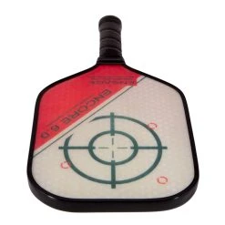 The Encore 6.0 Paddle ranges from 7.5 – 8.4 oz in weight so that you get a nice balance of speed and strength. The handle is 5″ long and uses a high tack, cushioned grip. A target-shaped design is placed high and near the center of the paddle face while a diagonal slice of color is placed in the lower corner.