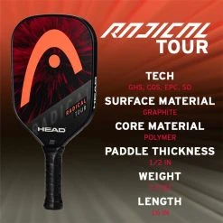 The Radical Tour Graphite Pickleball Paddle from HEAD Pickleball has an aerodynamic design with thoughtful features that make it a strong choice for higher level play. The tapered shape makes your swings feel smooth while the graphite surface provides extra touch and control due to its extreme spin texture. The comfort grip uses material that dampens vibration for more stability during play.
