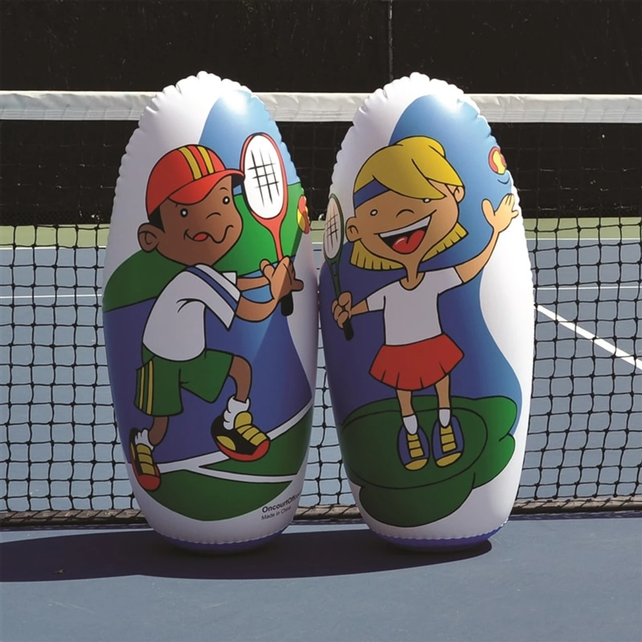 The Mini-Target Knockdowns come in a set of two and stand 36″ tall. One target features a boy wielding his racquet, while the other has a girl tossing a ball into the air as she prepares her serve. Technically, they’re holding tennis racquets and not paddles, but we think they work for pickleball just as well! The base should be filled with water before filling the top with air, as this serves to keep the inflatables standing tall after being hit. Be careful not to store near sharp objects or over-inflate the top.