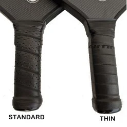 The grip circumference comes in two sizes with the option of either a thin or standard grip. We wanted this paddle to be accessible and comfortable for players of all types, so we are making this paddle available in both a thin 4″ and standard 4 1/4″ grip size. A black background and two stripes of color run diagonally across the paddle’s face with its name placed in the center.