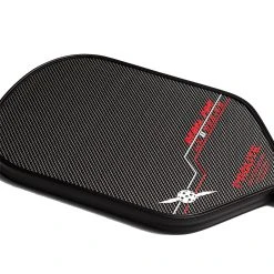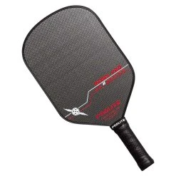 The Rebel Pro LX is a well-rounded option with a fairly long face which is the ideal match for players desiring a bit of extra reach; it measures 16″ in total, with a 4-3/4″ long handle. This model is slightly head-biased in terms of balance, increasing the swing weight behind your strikes, translating to extra power. It weighs in at 7.6 – 7.8 oz., maintaining a modest overall weight for quick reactions at the kitchen line. The handle has a small (4-1/8″) circumference that can be used as is by players with small-to-average sized hands, or built up with an overgrip for added cushioning and to fit larger hands. An innovative Aero Channel Edge Guard, designed to reduce drag, surrounds the face. A simple graphical design allows the carbon fiber and metallic strands to literally shine, with the paddle name and logo emblazoned across the lower half of the face.