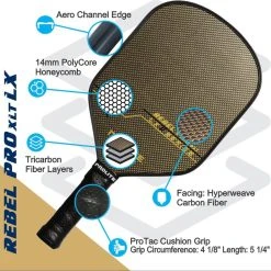 Finally, the thicker-than-average 14mm polymer honeycomb core is designed to reduce impact vibration. This core, sandwiched by three stiff carbon fiber layers per side, results in a forgiving control paddle up close, and a power beast from deep in the court. Don’t let the lack of flashy graphics fool you, the Rebel Pro XLT Hyperweave LX paddle from PROLITE Pickleball is absolutely beautiful and performs like no other.