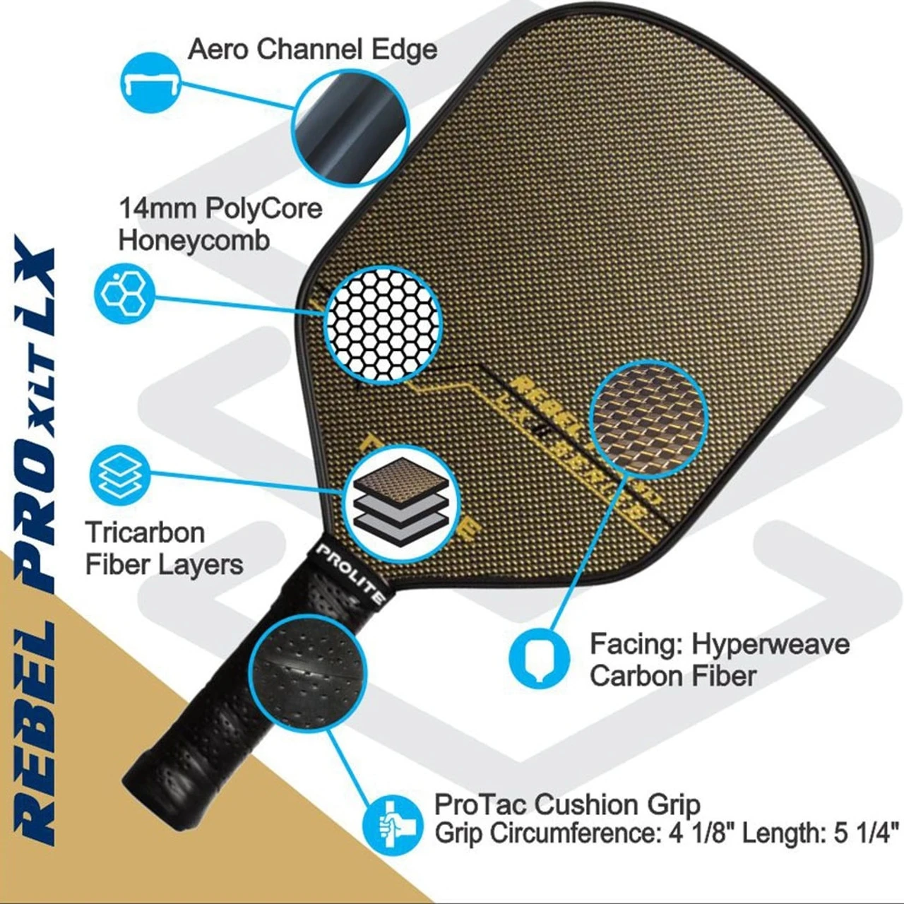 The Rebel Pro XLT LX Paddle is a part of the next generation “Hyperweave” series from PROLITE. Bringing to market a new take on paddle face materials and layering, PROLITE’s Hyperweave LX paddles combine three layers of carbon fiber per side, with the top layer relying on a tighter cross-weave and interwoven gold or silver fibers (your choice) to deliver some of the best looking and best performing pickleball paddles on the market today. The luxury look and premium performance of these paddles combine to give you the confidence to face all challengers.