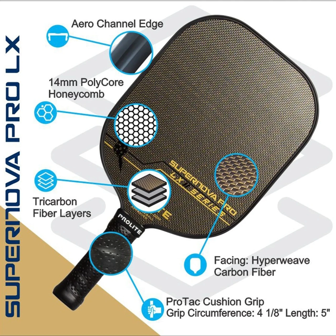 The Supernova Pro LX Pickleball Paddle is part of the next generation “Hyperweave” series from one of the original paddle brands, PROLITE. Bringing the most premium materials and fresh thinking to any paddle line they’ve ever released, PROLITE’s Hyperweave LX paddles are engineered using three layers of carbon fiber per side, as well as interwoven gold or silver fibers in the top layer (your choice) to create a pickleball paddle that looks and performs like no other. The Supernova has the capacity to be the most powerful paddle in the Hyperweave line thanks to its rounded proportions with a full 8″ width, and comparatively heavier weight. For players who desire a large surface area for blocking hard drives on defense, or the ability to blast a frozen-rope ground stroke from the baseline, the Supernova Pro LX delivers.