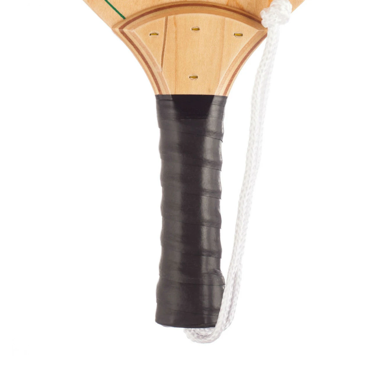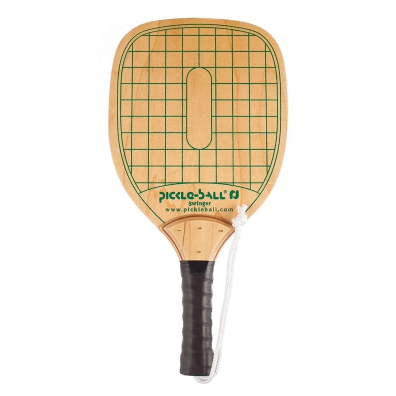 The Swinger Wood Pickleball Paddle is an extremely sturdy and well-priced, albeit heavy, wood paddle. Crafted from a resilient, five-ply hardwood, this paddle is sure to last throughout countless games. Many YMCAs, schools, recreation centers and other groups purchase this paddle for beginners and to use for loaner paddles. However, its heavy weight makes it best for adults. The face of the paddle is embellished with a visually-interesting, grid-like pattern. This paddle has a white rope wrist strap, which aims to keep the paddle in the player’s hand and off the ground. The handle itself is wrapped with a black grip. The handle overlaps the end of the paddle’s face, creating a small ridge on either side of the paddle.