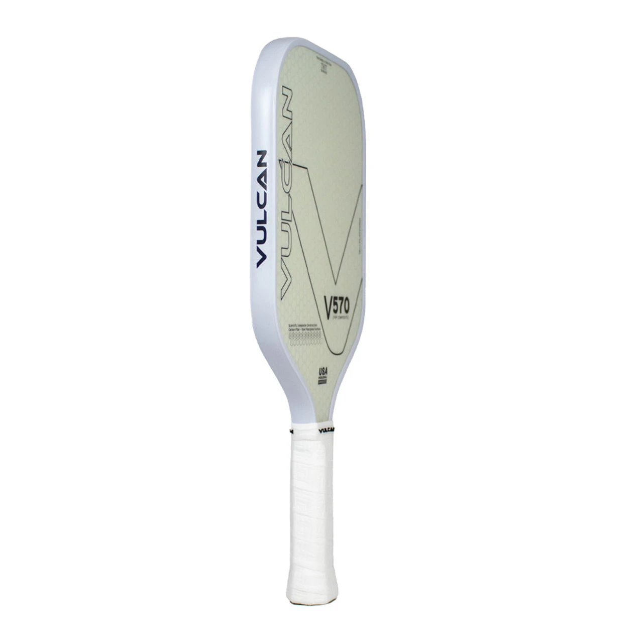 The V570 FRP paddle from Vulcan Pickleball uses a textured raw fiberglass face to situate itself as the more poppy and powerful paddle in the V570 line.